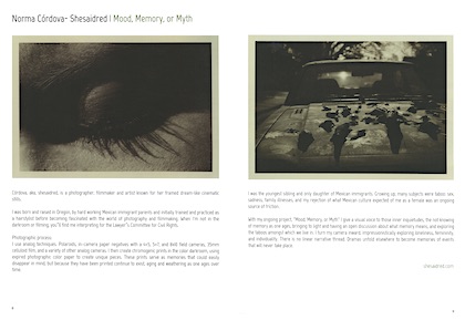 She is currently moving her creative practice to a new home, working on building a color darkroom, and also helping interpret in asylum cases for the Lawyer’s Committee for Civil Rights.