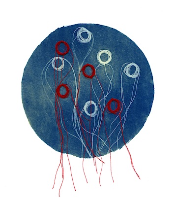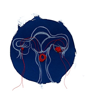 During my recent move, I rediscovered these images and started experimenting, using stitching and oil pastels. They became this project, “Oocitos Ovarios - Red, Blue and You.”