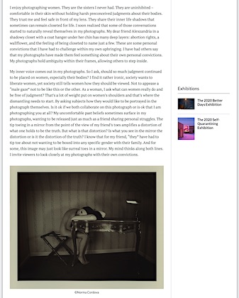 Córdova is a Mexican-American artist, born and raised in Oregon, by hard working Mexican immigrant parents. Her image based work creates illusions that conjure the realms of the imagination without presenting a factual reality. They intersect femininity, self identity, and wonder. Her work has been exhibited in the US and abroad, and has been published in The New Yorker, New York Times, Vice, PDN, and Lenscratch. In 2020, Córdova was included in the Top Photolucida 50 Critical Mass, and won best of show at the Center for Photographic Art’s International Juried Exhibition.